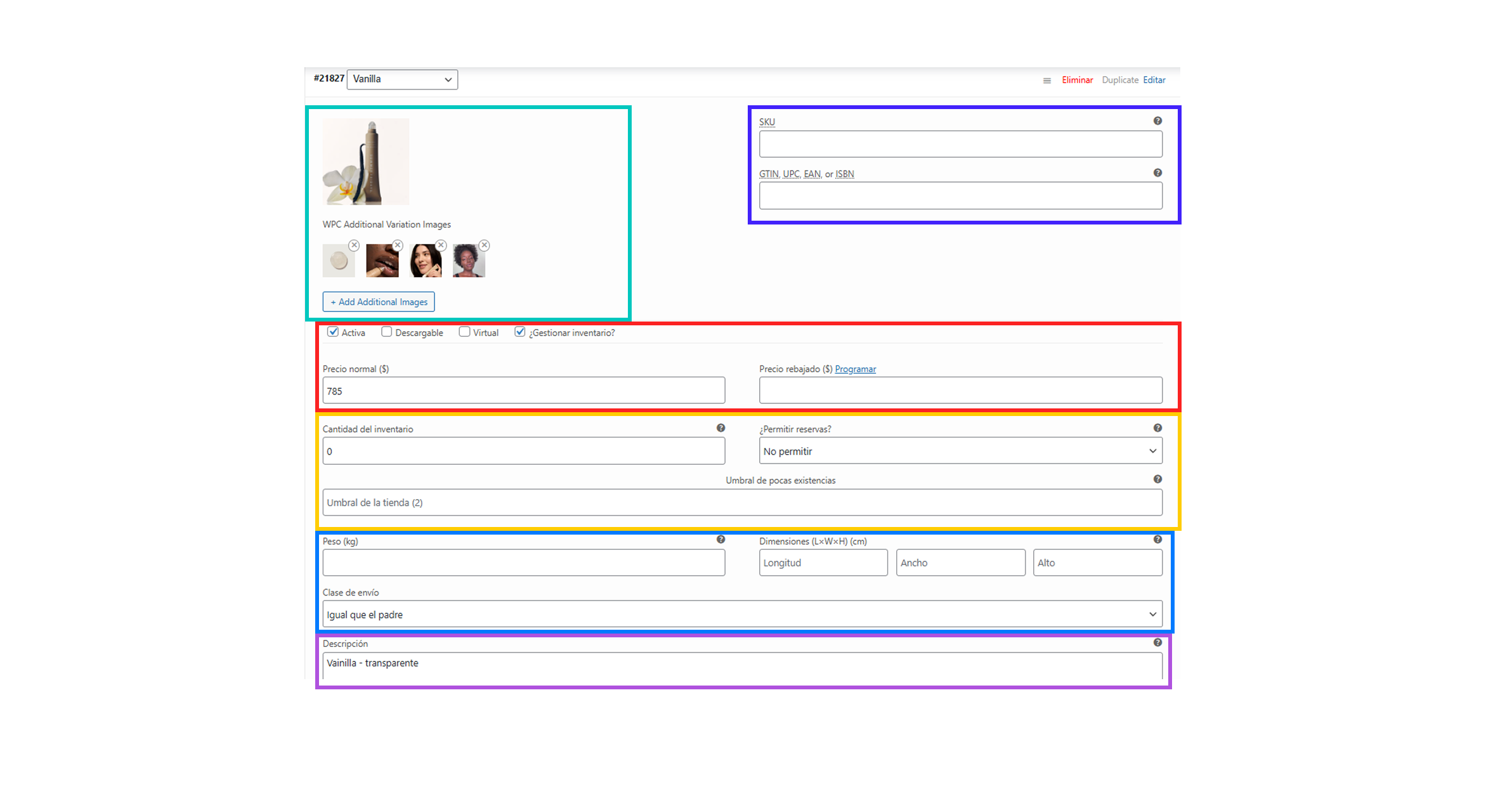 Contiene la imagen principal que es la que se tendrá como principal a mostrar cuando la persona seleccione la misma, en la parte inferior puede colocar imágenes adicionales para cada variante.