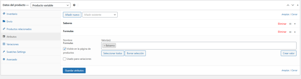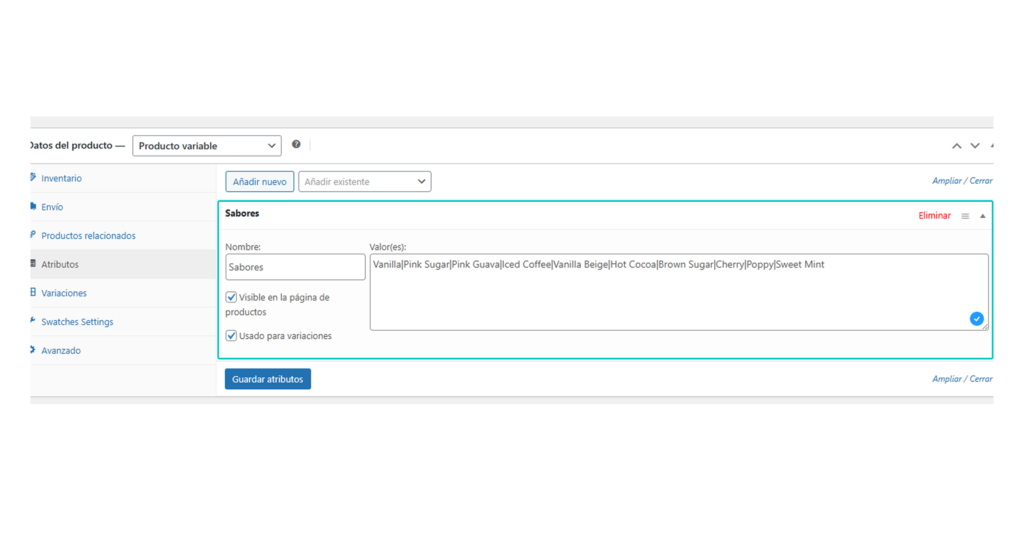 2. Nos dirigiremos a la sección de Atributos para dar clic en añadir nuevo y comenzamos dándole el nombre al grupo de opciones del producto: Ejemplo aquí Sabores. Y una vez establecido el nombre hay que agregar en la sección de Valores todas las opciones separadas por una barra vertical |