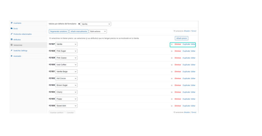 Las variaciones tienen algunos controles disponibles para ajustarse: Aqui puede: Establecer la variacion seleccionada por defecto, mover las variaciones para establecer un orden, duplicar y editar la información dentro de cada una de ellas.