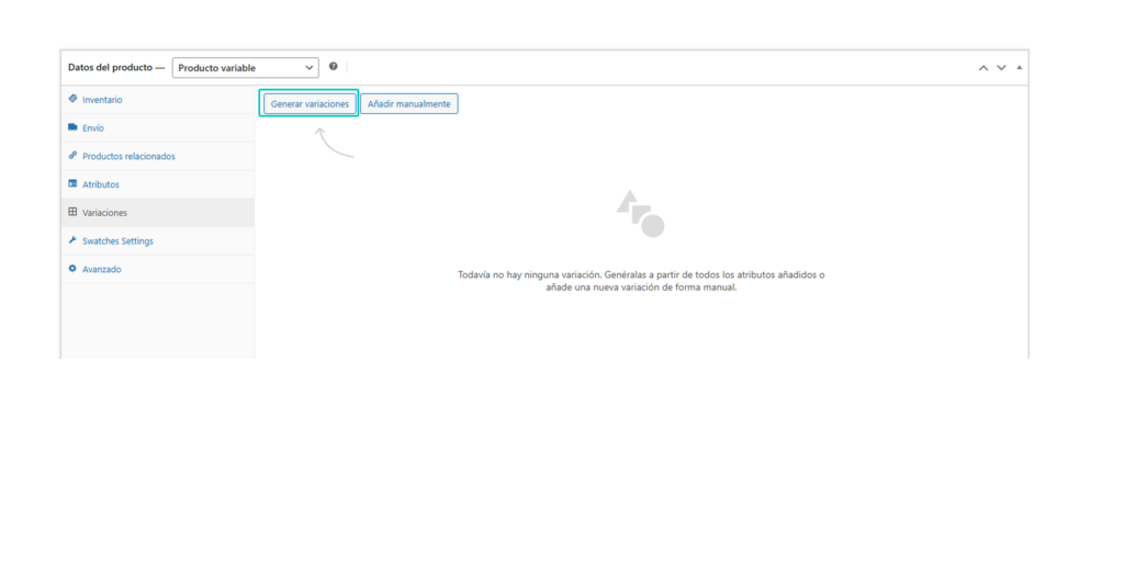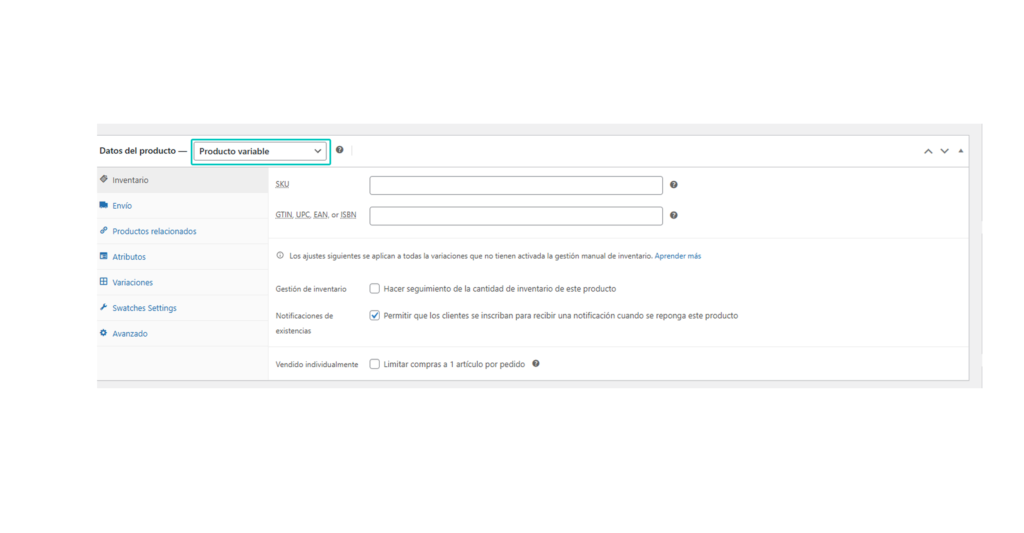 1. El producto debe ser variable para que le permita colocar variantes seleccionables más adelante.
