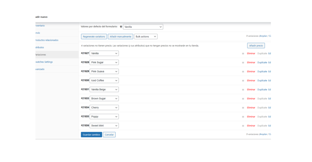 Para finalizar este paso de clic en guardar cambios para que se guarde la información de su variación.