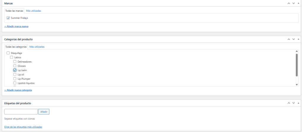 Categorías de producto: Seleccione solo la categoría o subcategoría a la que pertenece del árbol. *No es necesario que seleccione todas las opciones: Ejemplo aquí es un lipbalm -> por ende solo se selecciona lipbalm.